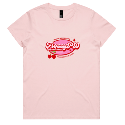 WOMEN'S T-SHIRT ~ FlossyPD Brand Logo on Pale Pink soft fall T-Shirt - Poetry on our Breasts.